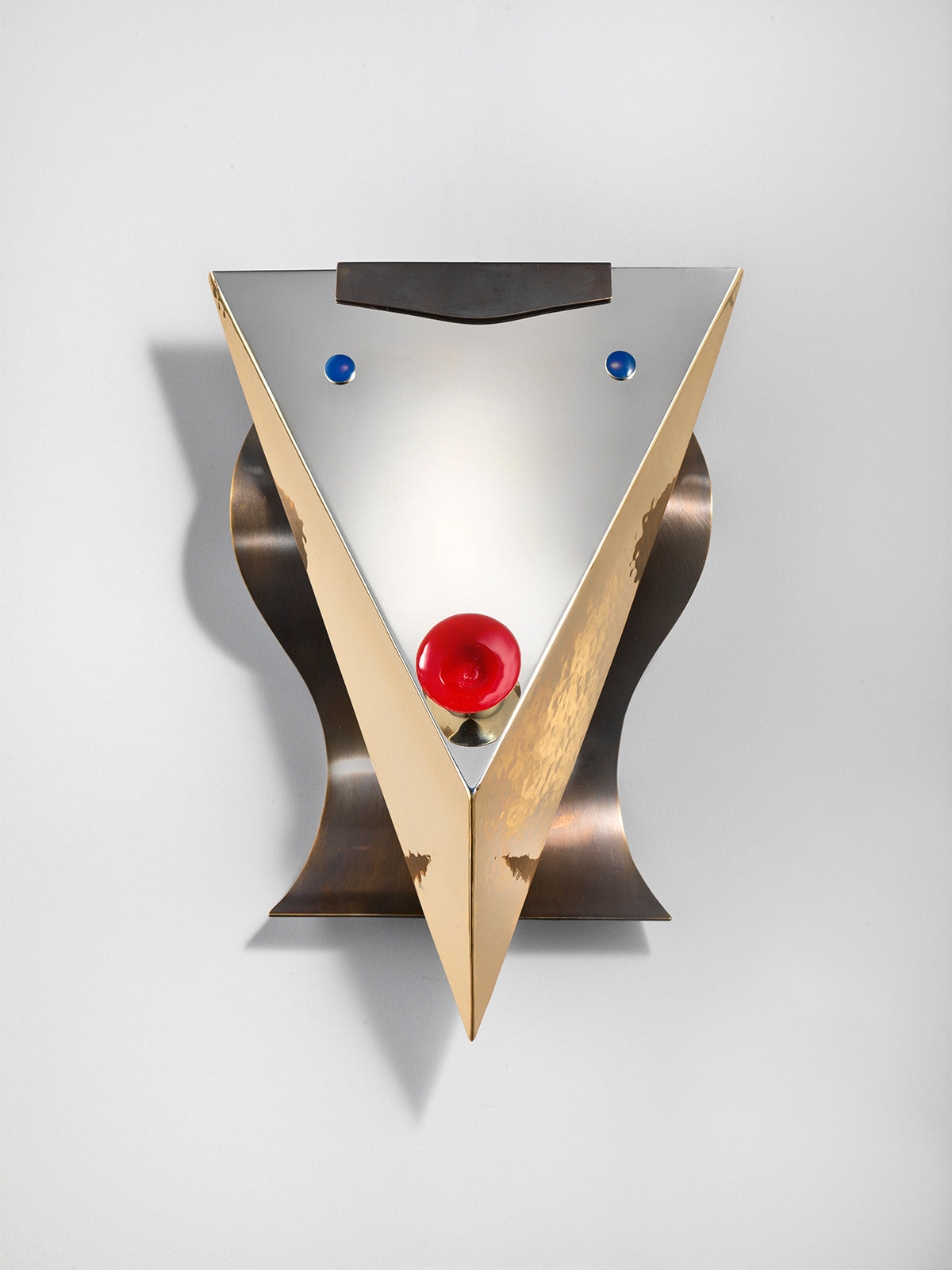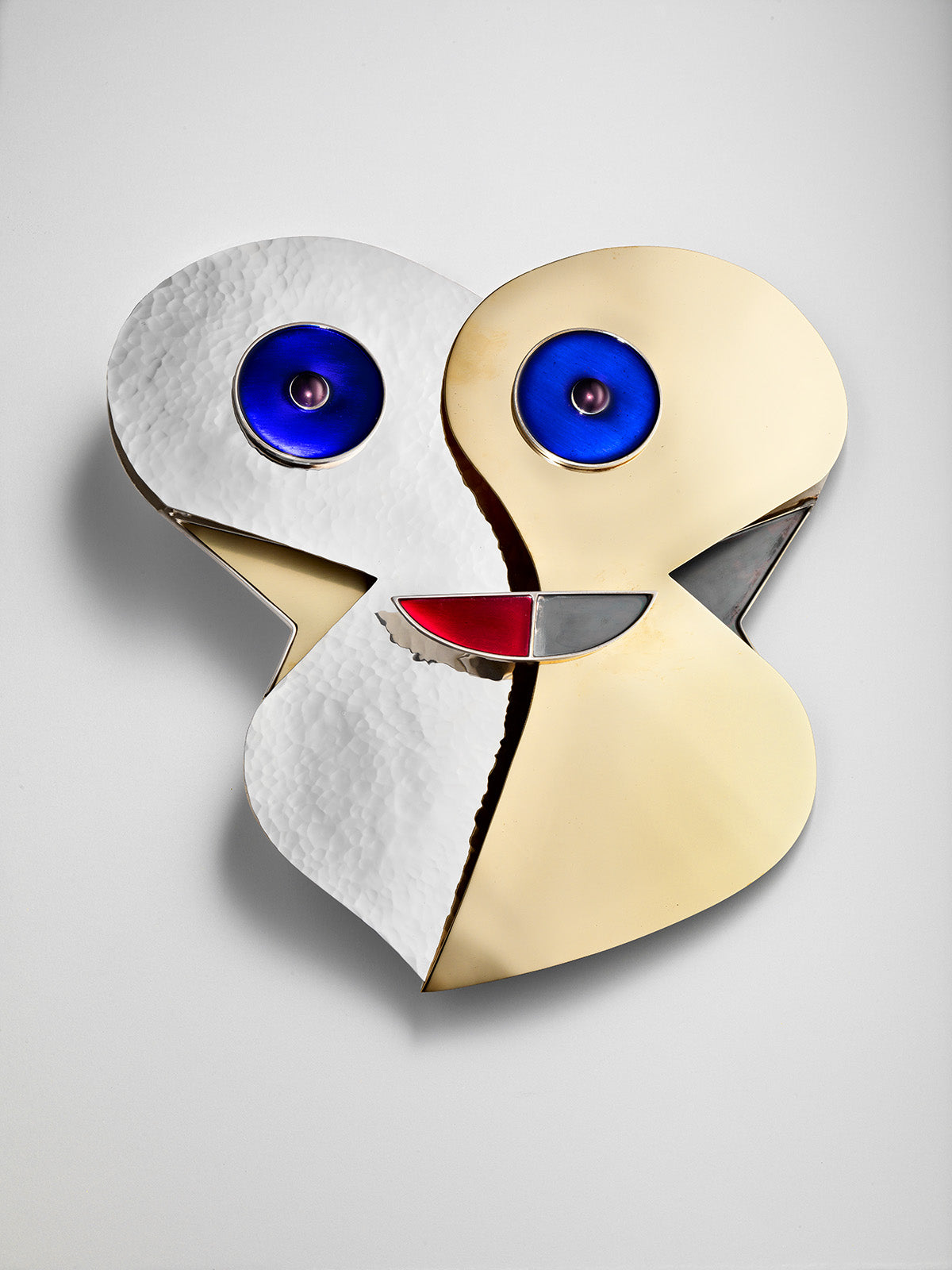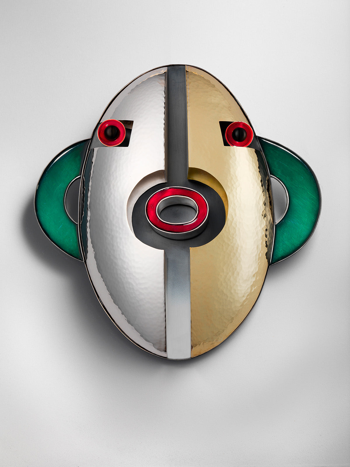 To be hung on the wall. Crafted in silver plate, brass, and copper, with various finishes and some surfaces hand-beaten; Limited edition of 9 examples and 3 test pieces of each.These masks, or rather portraits, as Mendini specifies, were designed for the exhibition held in summer 2017 at the Museo della Casa Rossa in Anacapri, entitled Mendini Depero